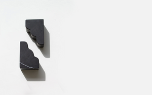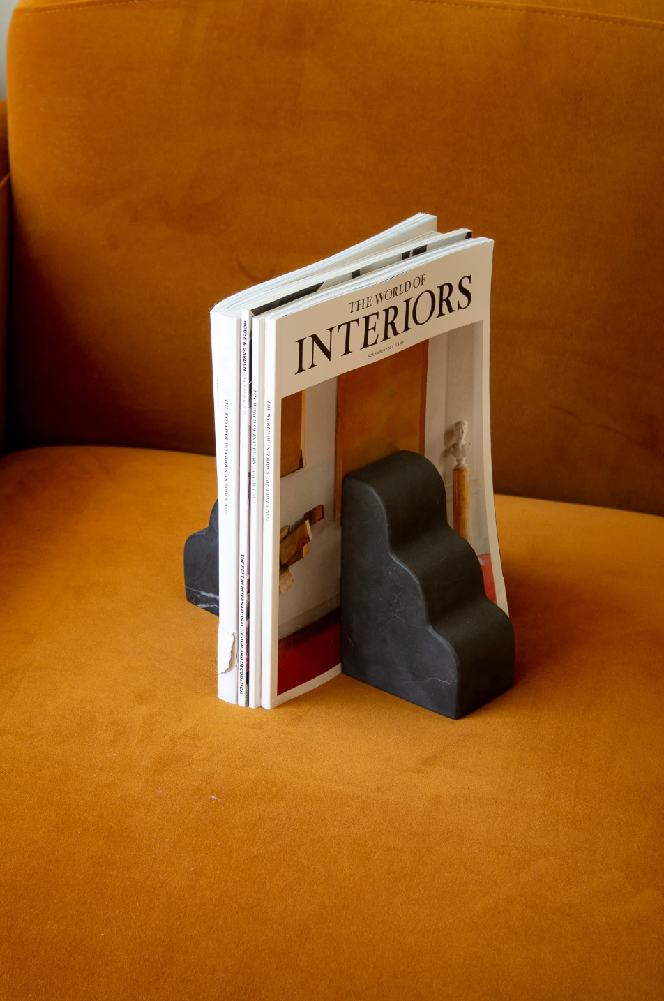 Using Spanish Nero marble, each bookend is made by hand in Queens, New York. Each curve is grinded down meticulously and finished in a honed texture. A deep black marble with striking white veining.