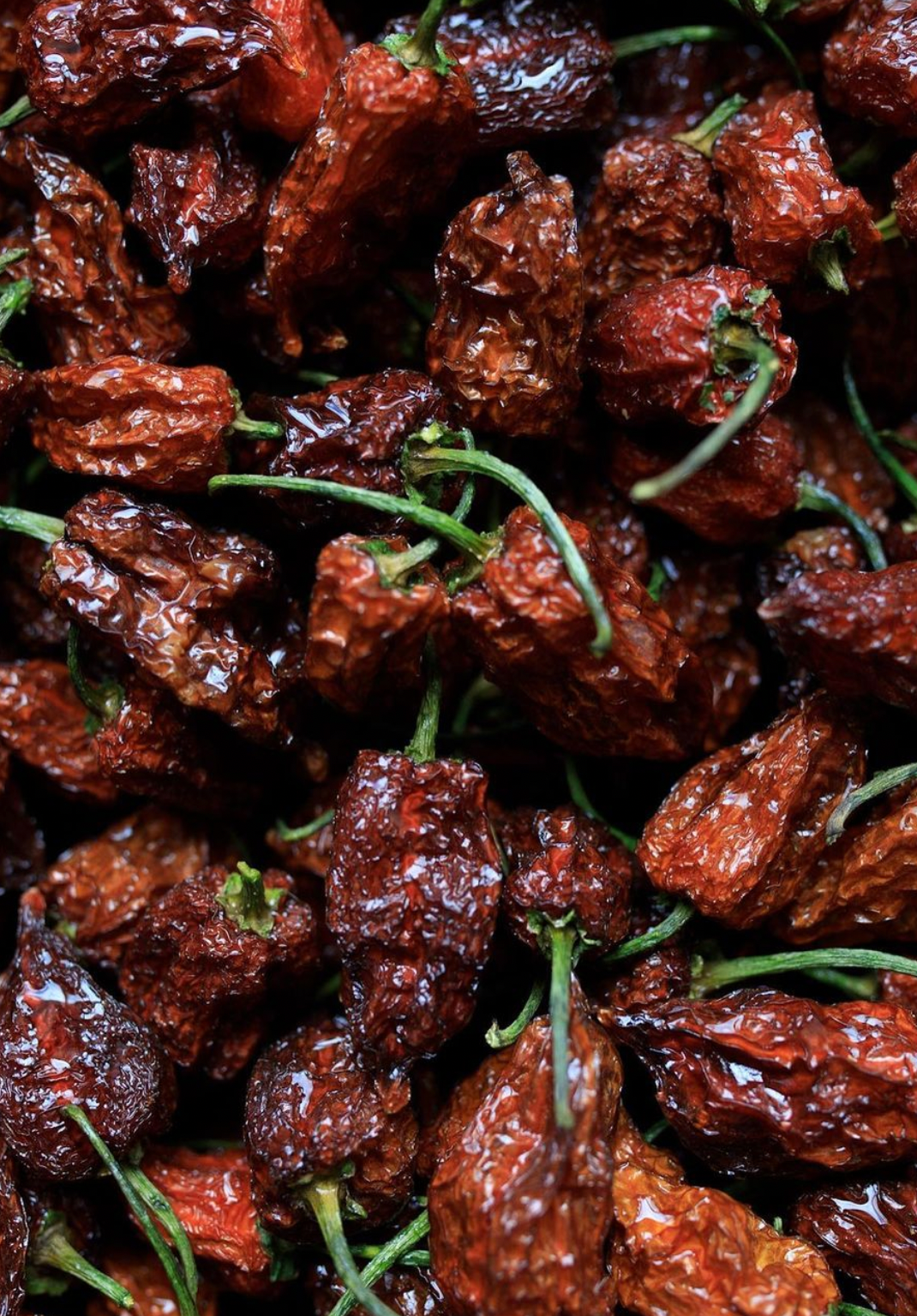 Peppers grown in organic regime, and organic extra virgin olive oil from Tuscany, Italy.