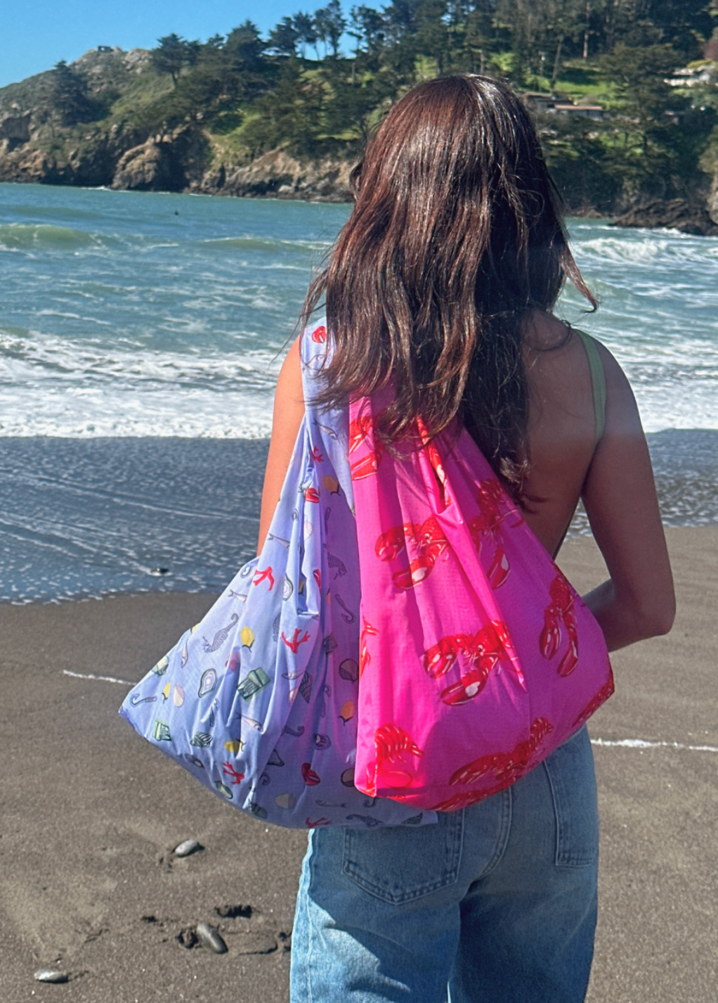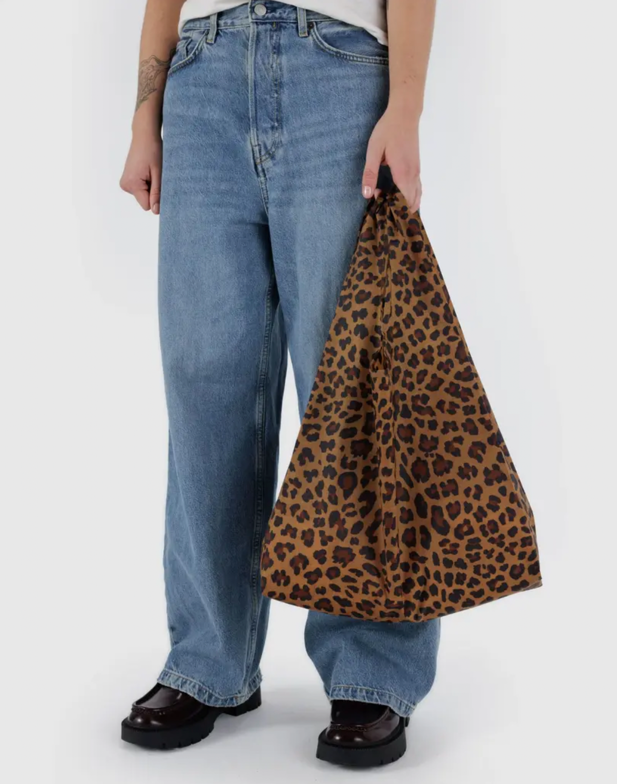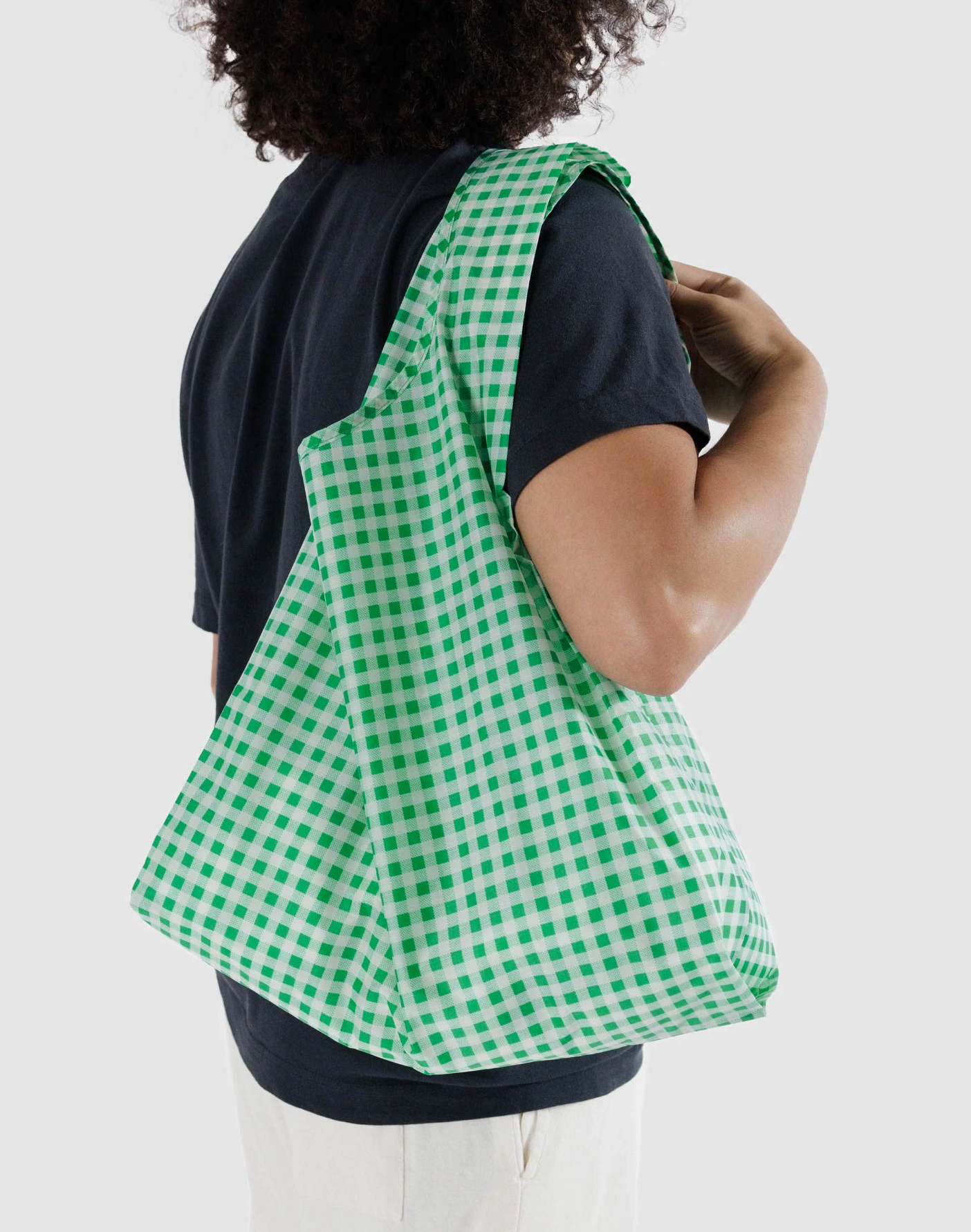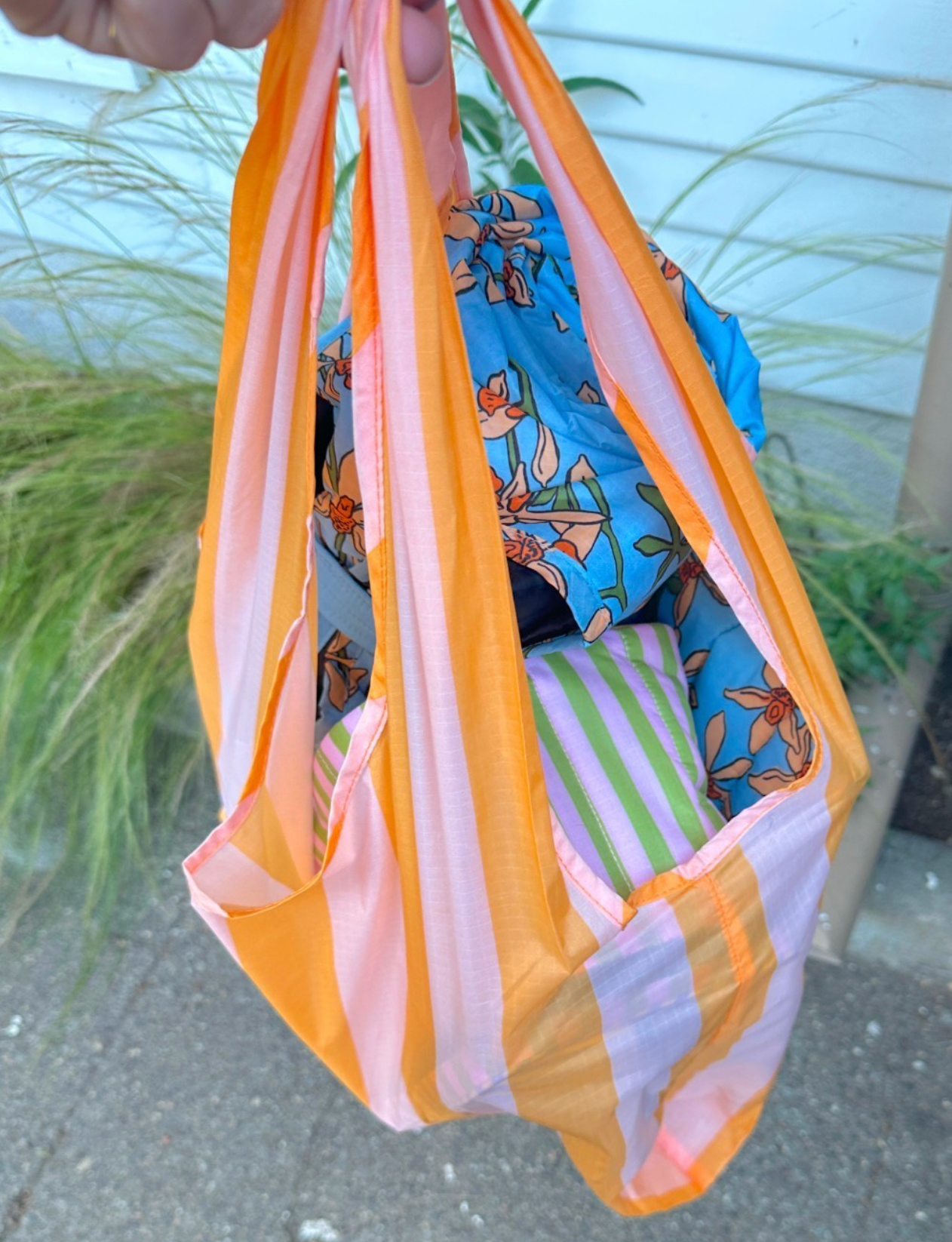 The Baggu standard bag carries 2-3 plastic grocery bags worth of stuff comfortably in hand or over your shoulder. They hold up to 50 lbs!