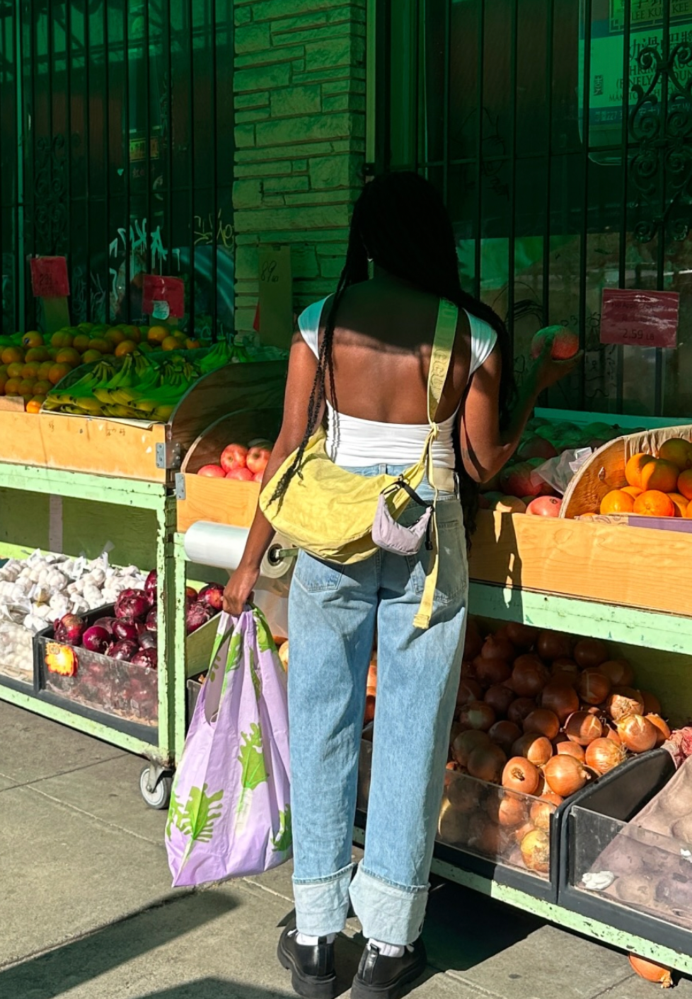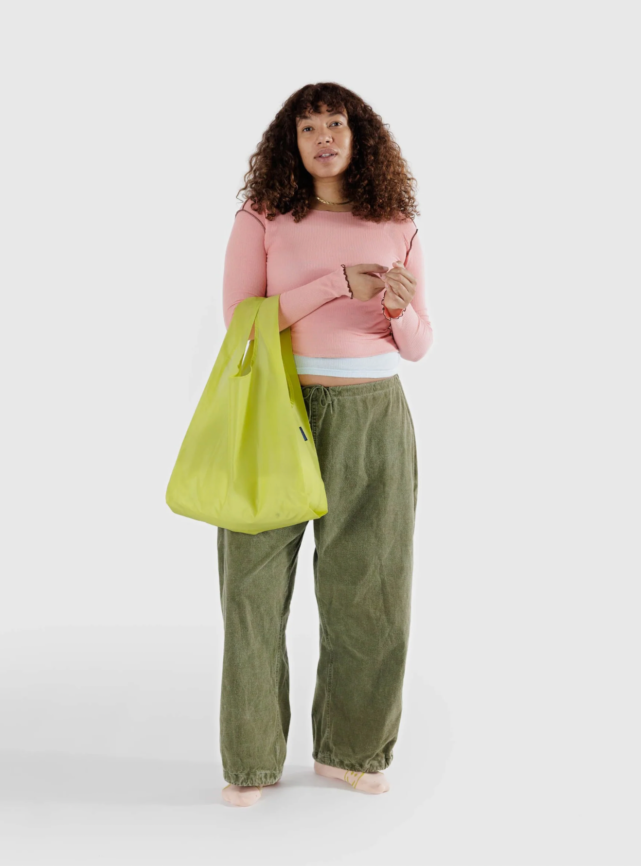 All of Baggu's standard bags are made of 100% recycled nylon filament yarn. This 100% recycled nylon yarn is produced from pre-consumer waste, which saves scrap material from being landfilled - meaning every Standard Baggu is now made entirely from nylon that would otherwise go to a landfill.