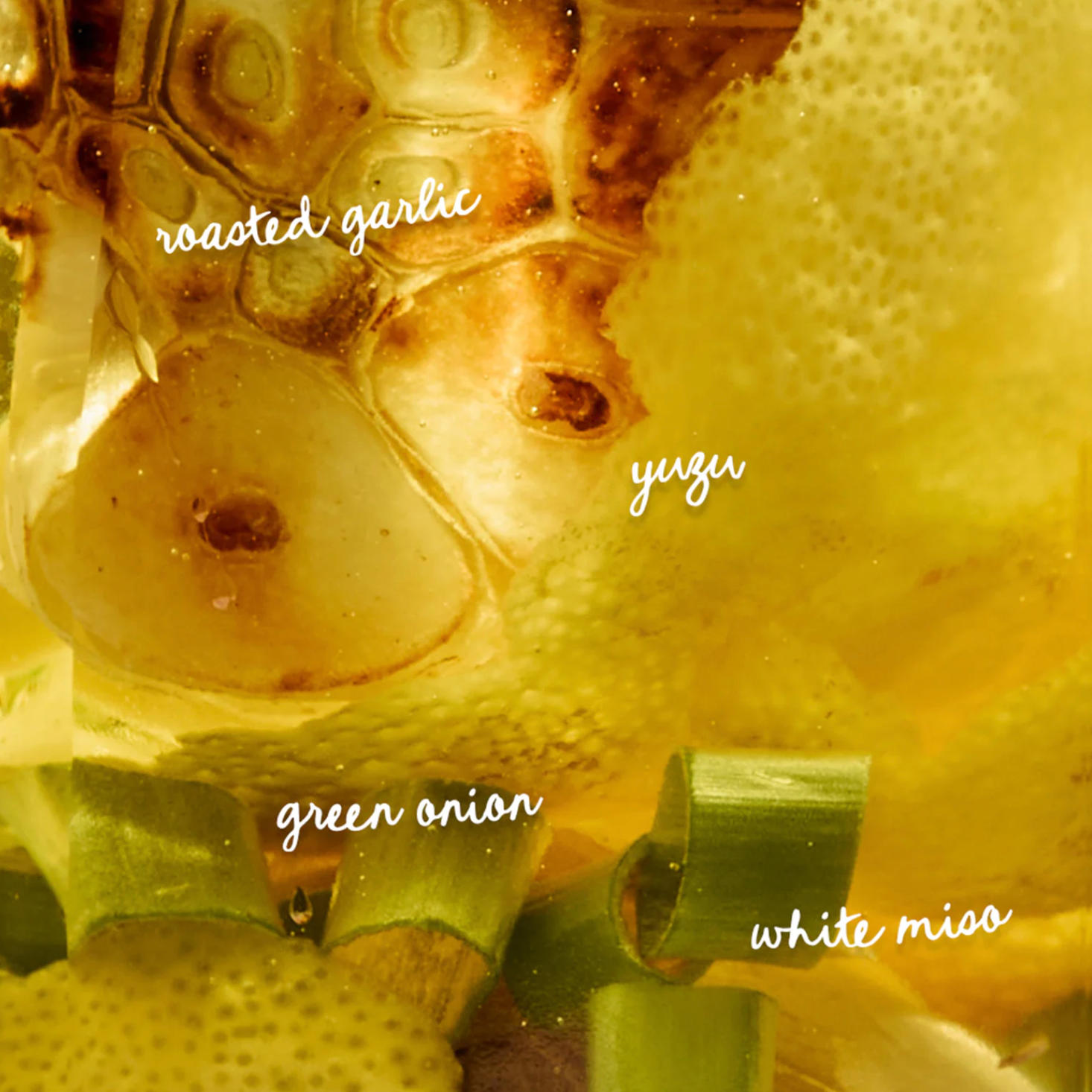 Culinary algae oil, roasted garlic, miso powder, scallions, garlic extract, yuzu extract, vitamin e. Contains soy.