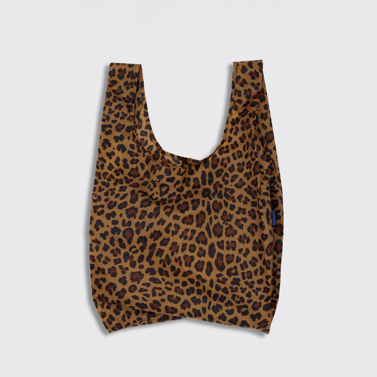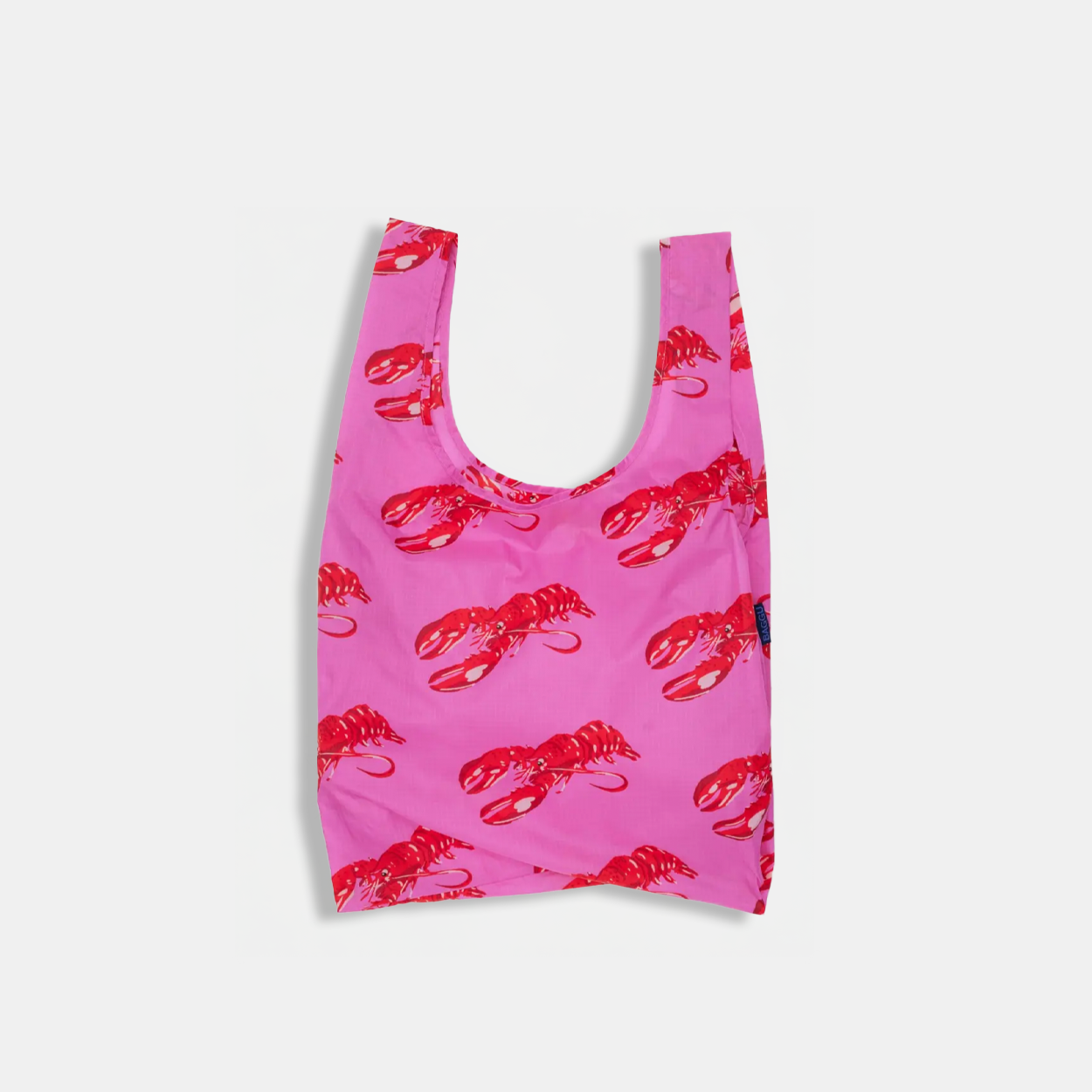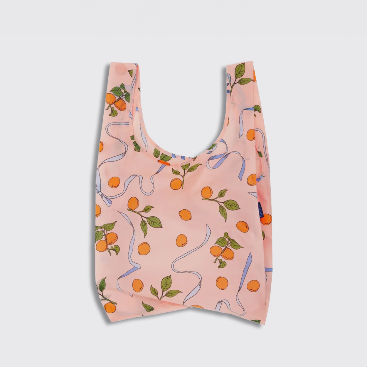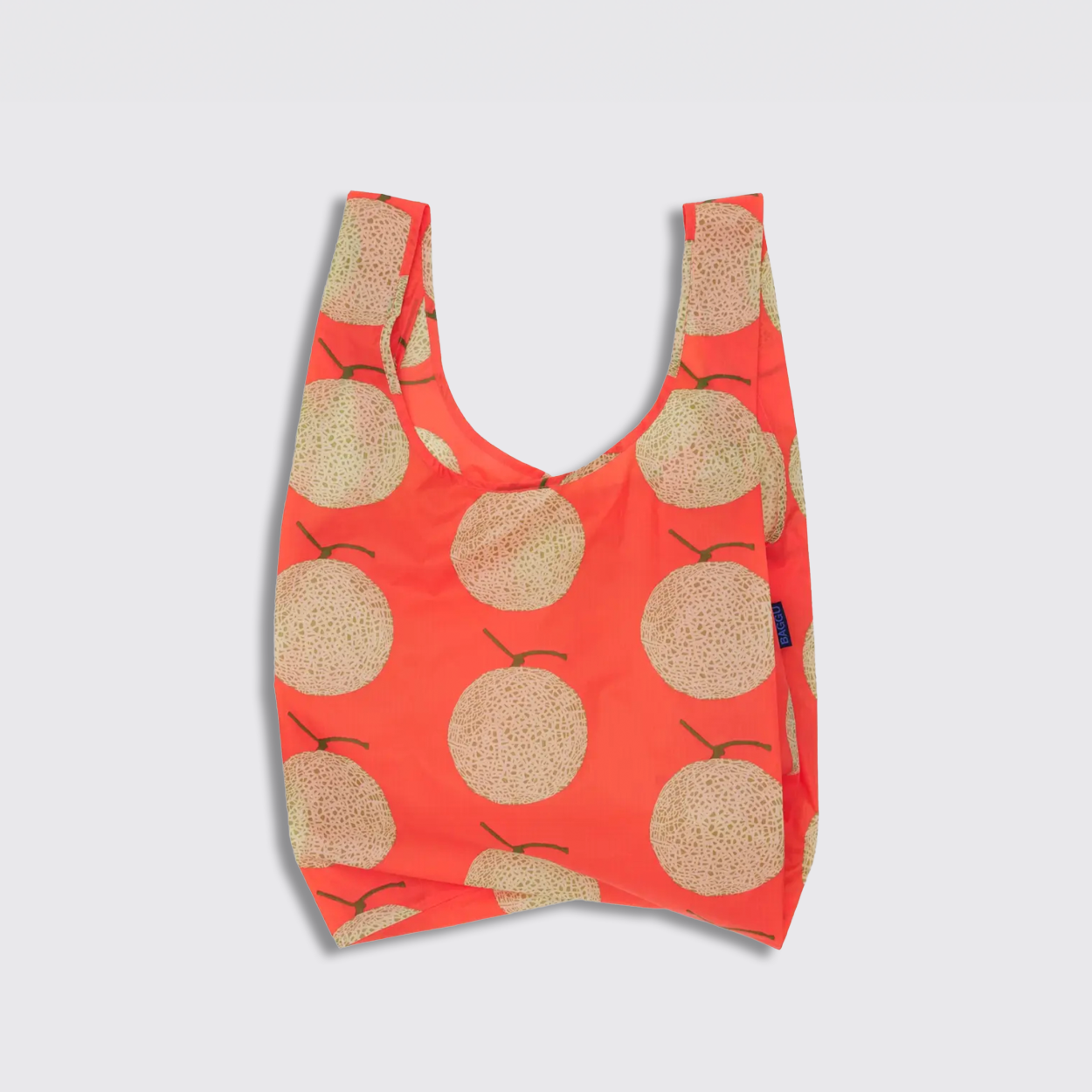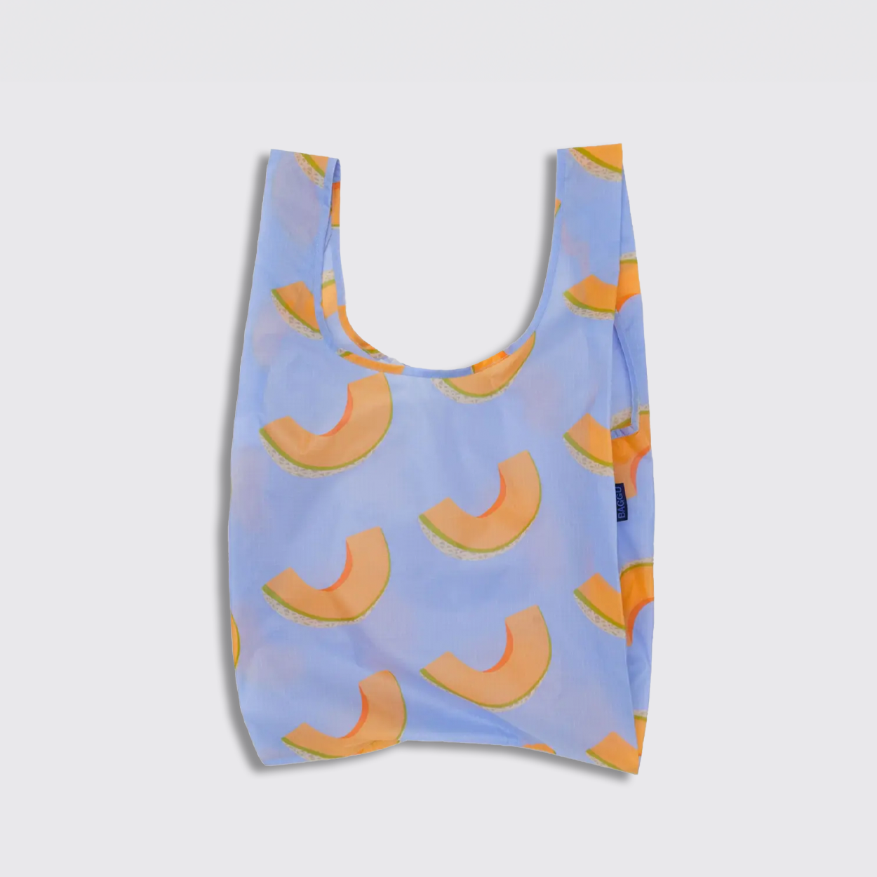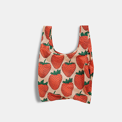 The Baggu standard bag carries 2-3 plastic grocery bags worth of stuff comfortably in hand or over your shoulder. They hold up to 50 lbs!